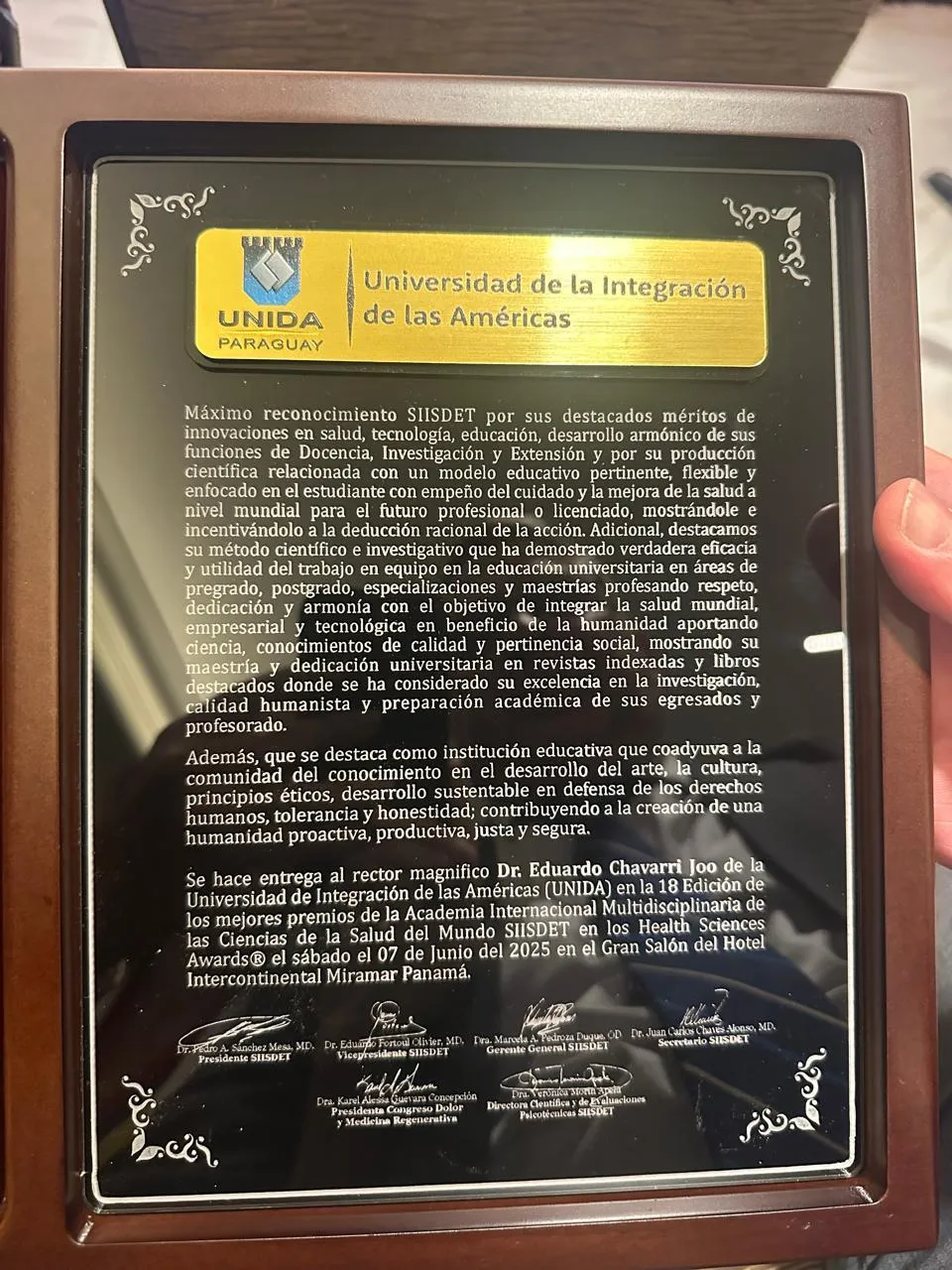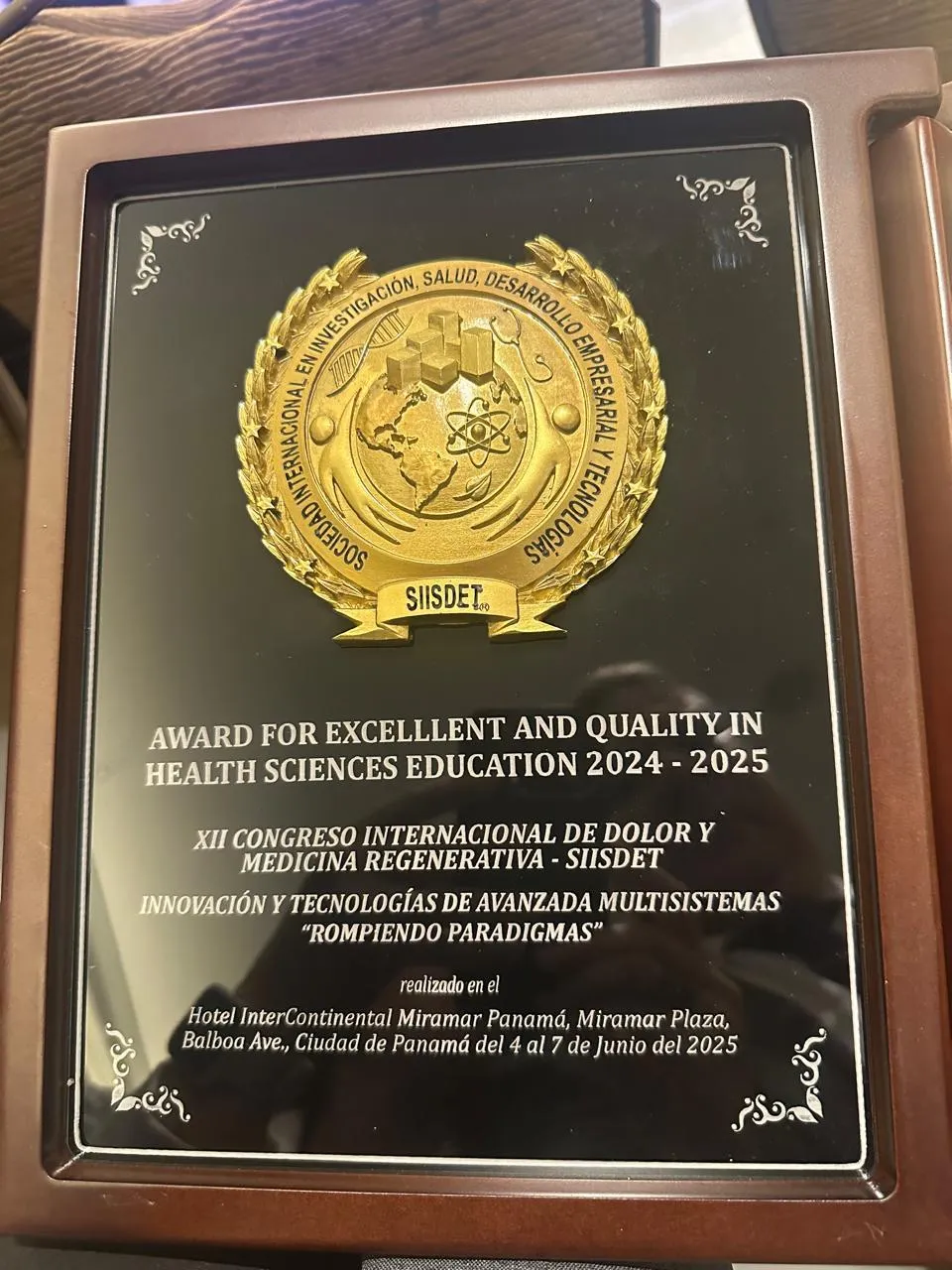La UNIDA fue reconocida internacionalmente con el premio a la Excelencia en Educación en Ciencias de la Salud 2024–2025, durante el XII Congreso Internacional de Dolor y Medicina Regenerativa en Panamá.